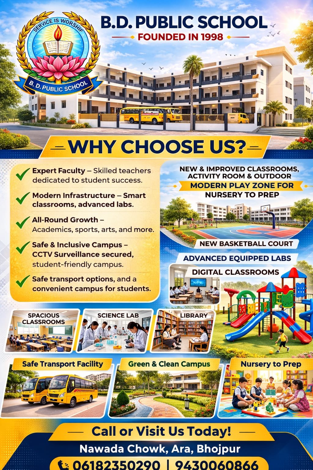 To provide an educational environment in which students feel safe, secured, empowered, energized and unlimited in pursing learning experiences to their maximum potential. B.D. Public School provides holistic education that emphasizes high academic and social standards, promotes healthy life style, cultivates critical thinking, fosters scientific temper, instills desires for lifelong learning.